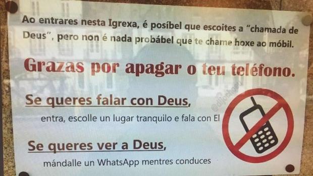 Cansado de que los asistentes a los oficios religiosos no se despegasen del móvil, el cura de A Ramallosa en el municipio pontevedrés de Nigrán, decidió tirar de retranca. Esta semana colocó un cartel a la entrada del templo pidiendo que apagasen sus teléfonos. La foto se está haciendo viral en las redes sociales desde que lo subió a Twitter la cuenta @Dijochoeu.